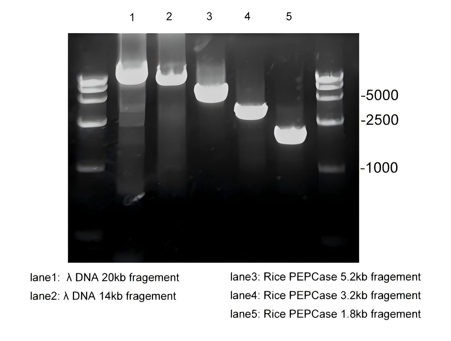 以水稻基因组做模板,配合10×Long Taq PCR buffer可以很好扩增PEPCase 5.2kb DNA片段。